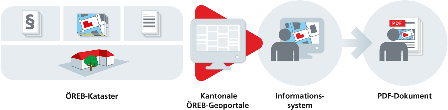 Weil der ÖREB-Kataster durch die katasterverantwortliche Stelle digital geführt wird, können Informationen rund um die Uhr abgerufen werden. Dabei wird unterschieden zwischen der dynamischen Online-Abfrage via Informationssystem und dem ÖREB-Katasterauszug (PDF-Dokument).