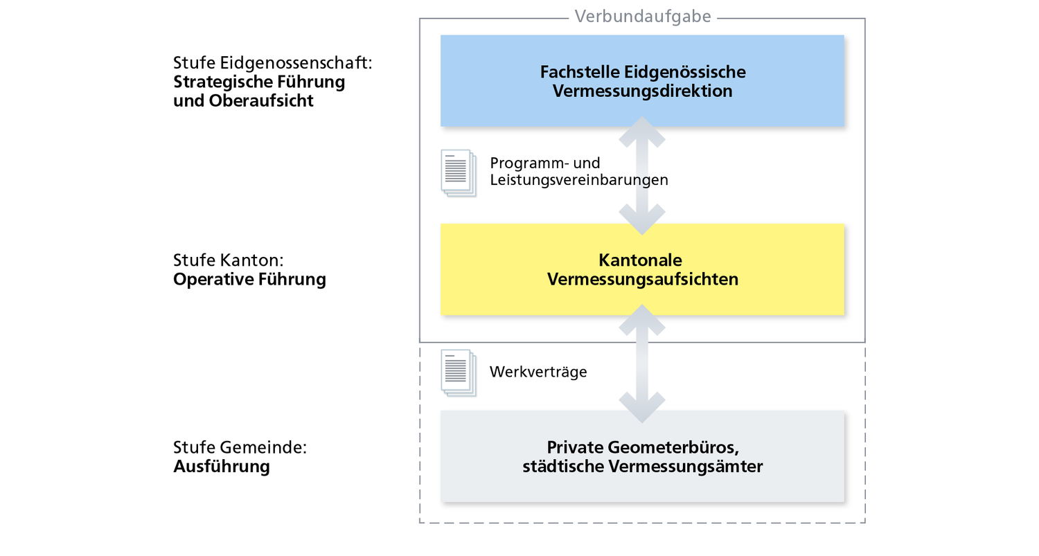 Die amtliche Vermessung ist sowohl eine Verbundaufgabe zwischen Bund und Kantonen, als auch ein gutes Beispiel einer erfolgreich funktionierenden Zusammenarbeit zwischen der Fachstelle Eidgenössische Vermessungsdirektion, den kantonalen Vermessungsaufsichten, den städtischen Vermessungsämtern und den privaten Ingenieur-Geometerbüros. Bund und Kantone teilen sich die Führungsaufgabe: Dem Bund obliegen die strategische Führung und Oberaufsicht, die operative Führung liegt bei den Kantonen.