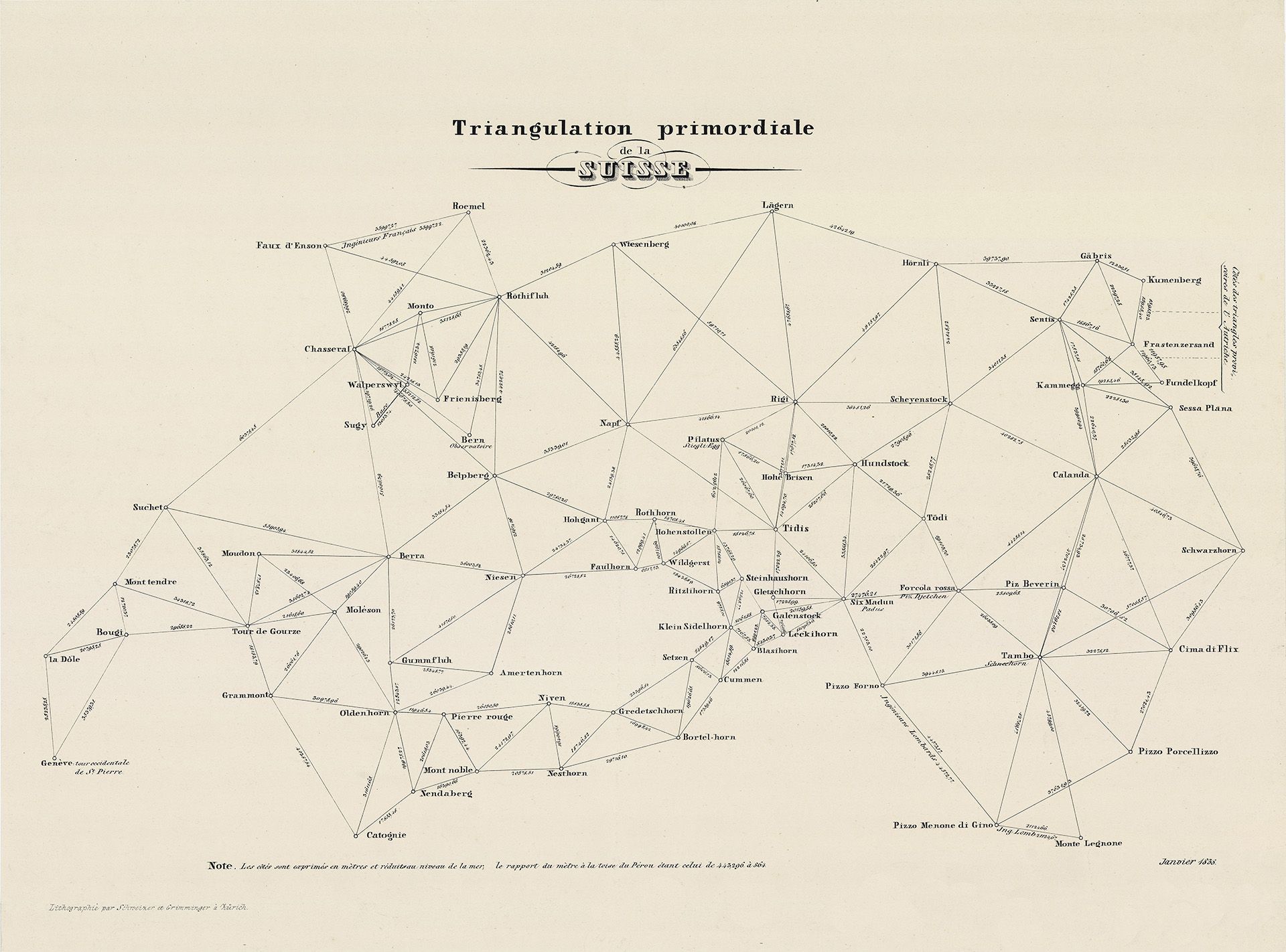 Johannes Eschmann (1808–1852) complète les lacunes restantes dans la triangulation de Ier ordre et mène à terme provisoirement les travaux de calcul de l’ensemble du réseau, y compris les triangulations d’ordre inférieur. Il publie ces travaux en 1840 sous le titre «Résultats des mensurations trigonométriques en Suisse».