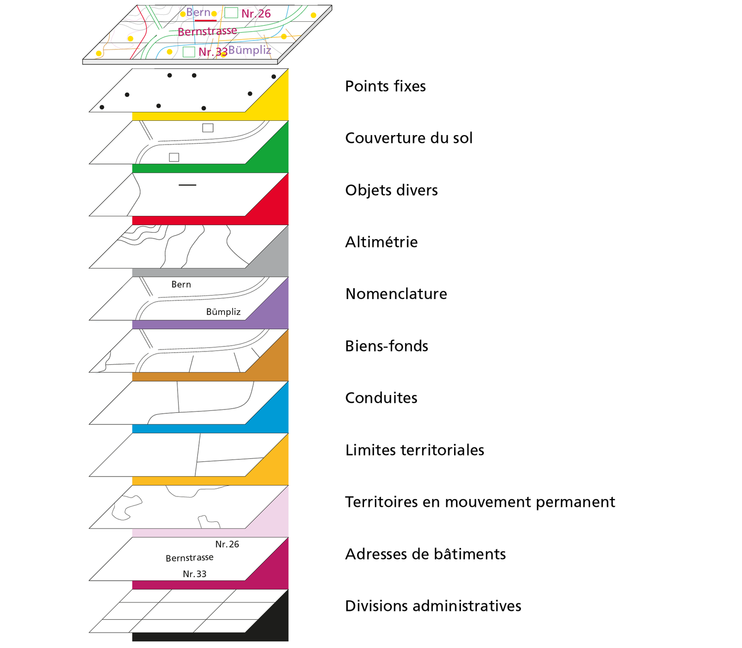 Avec l’entrée en vigueur des ordonnances sur la mensuration officielle (OMO, OTEMO), les données relevées par la mensuration officielle sont désignées comme jeu de données de base et structurées par couches d’information. Les données de la mensuration officielle doivent servir de base aux systèmes d’information du territoire et pouvoir être utilisées à des fins publiques et privées. Les supports de plans conventionnels sont peu à peu remplacés par des bases de données.