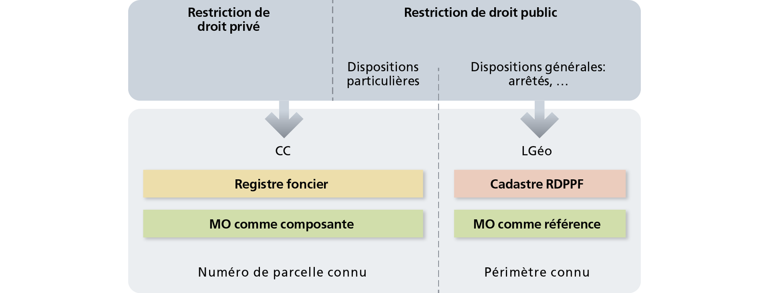 Le registre foncier consigne les dispositions de droit privé qui s’appliquent à un bien-fonds donné. Le cadastre RDPPF contient les dispositions de droit public, qui restreignent l’utilisation d’un bien-fonds.