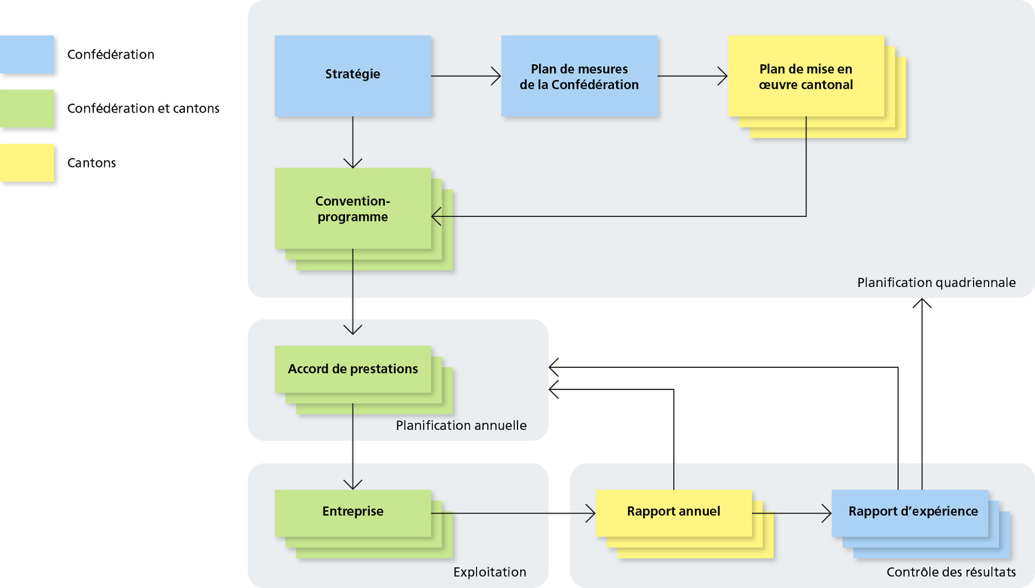 Sur la base de la stratégie de la mensuration officielle, les cantons établissent leur plan de mise en œuvre cantonal. La Confédération et les cantons se basent sur ce plan pour définir leurs prestations dans la convention-programme quadriennale. La convention de prestations annuelle concrétise notamment l’utilisation du crédit d’engagement quadriennal.
