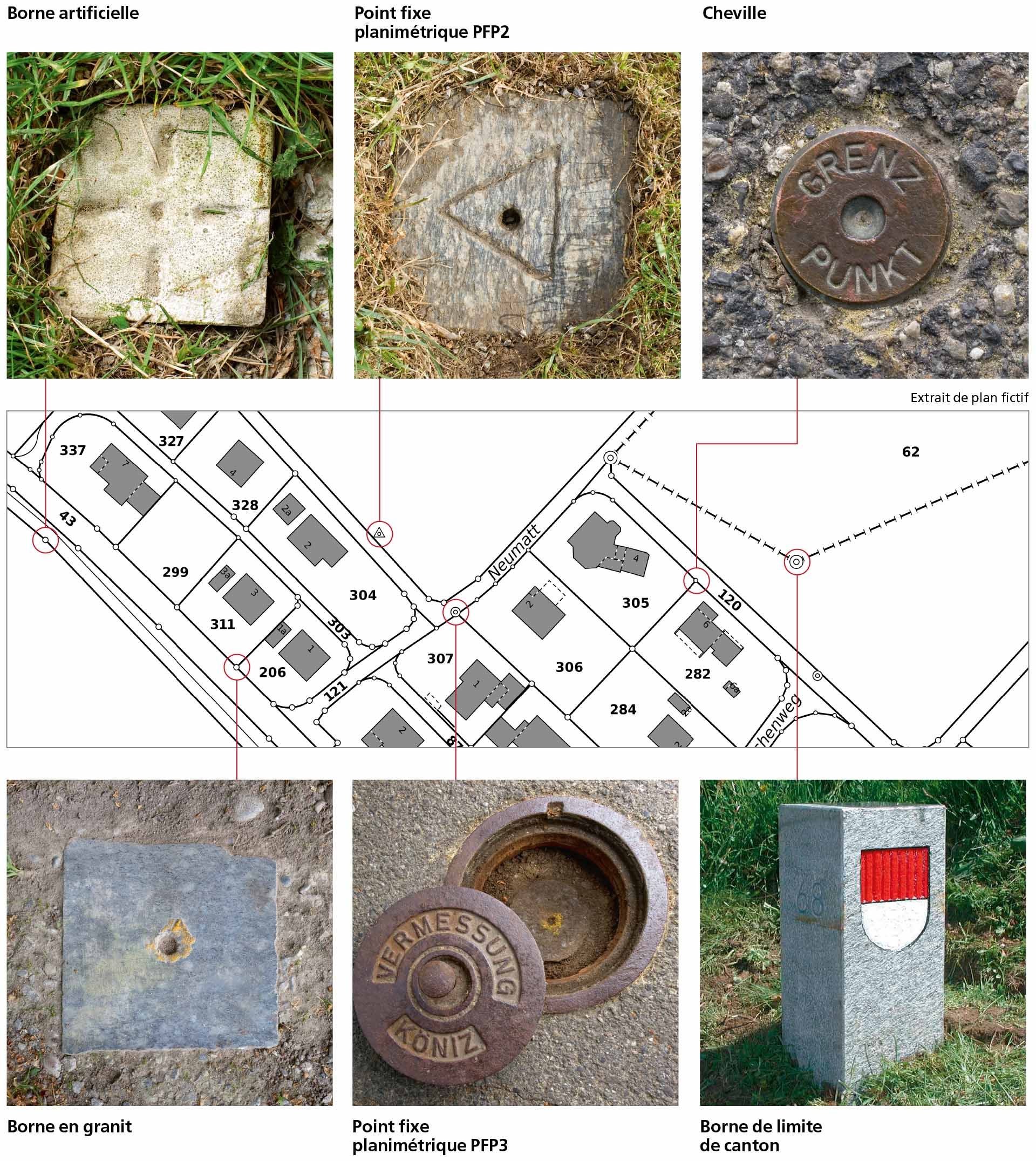Les points limites sont matérialisés sur le terrain par des signes de démarcation prenant la forme de bornes en granit, de chevilles en laiton, de tuyaux, de bornes artificielles ou de croix gravées dans la pierre. Les bornes délimitant le pays, les cantons et les communes sont généralement imposantes, portent fréquemment des dates et sont souvent ornées d’armoiries.