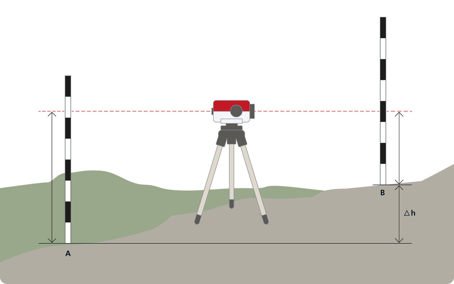 Un metodo collaudato e molto accurato per determinare le differenze di altitudine è la livellazione. Lo strumento di livellazione viene posizionato tra due aste di misurazione verticali e la sua linea di riferimento viene allineata orizzontalmente. La differenza tra le due letture sulle aste di misurazione fornisce direttamente la differenza di altitudine.