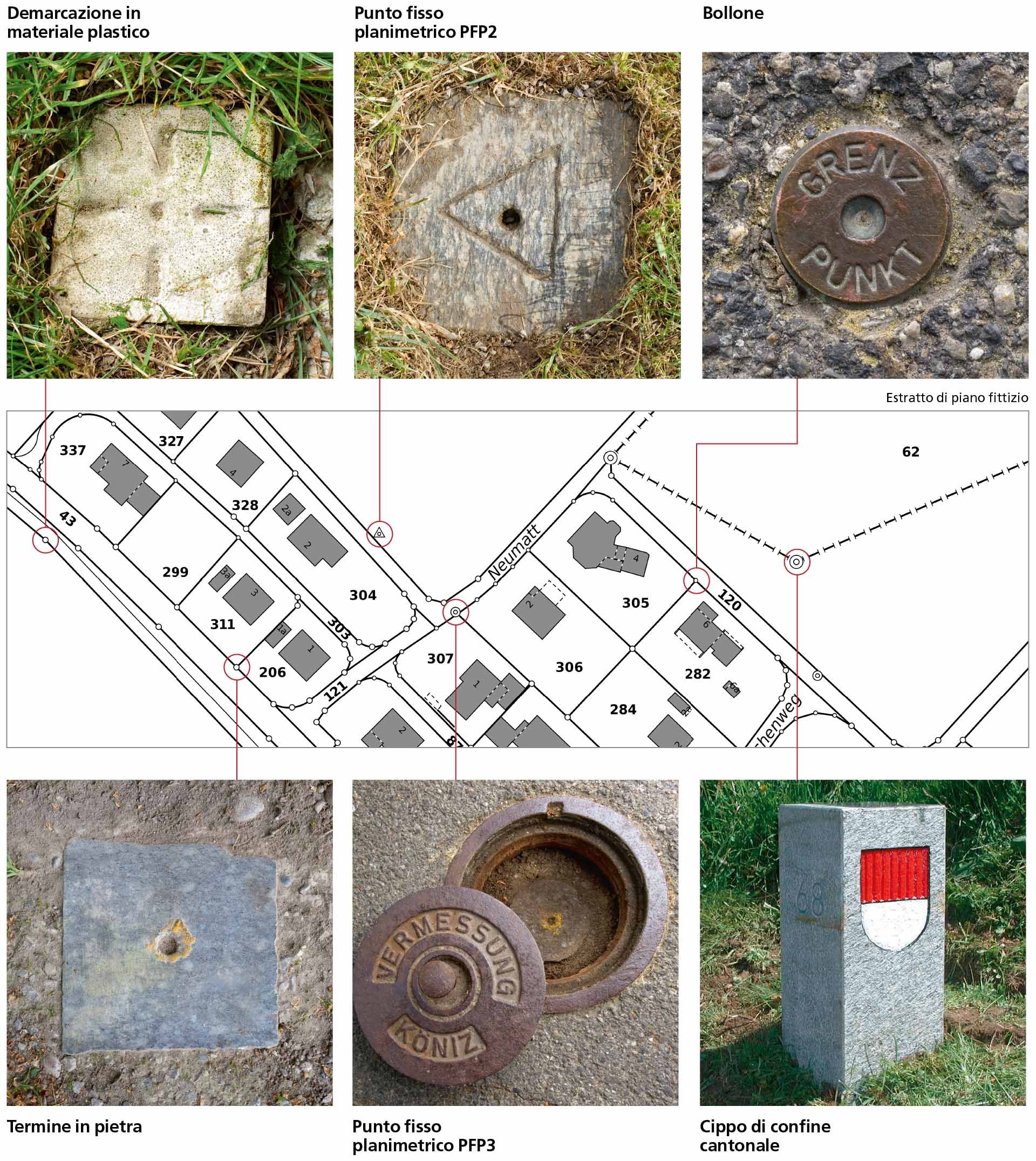 I punti di confine vengono contrassegnati sul terreno per mezzo di segni di confine: cippi di granito, bolloni in ottone, tubi, demarcazioni in materiale plastico o croci scolpite nella pietra. I confini di Stato, cantonali e comunali sono in genere molto ben visibili; in molti casi sono inoltre decorati con date e stemmi.