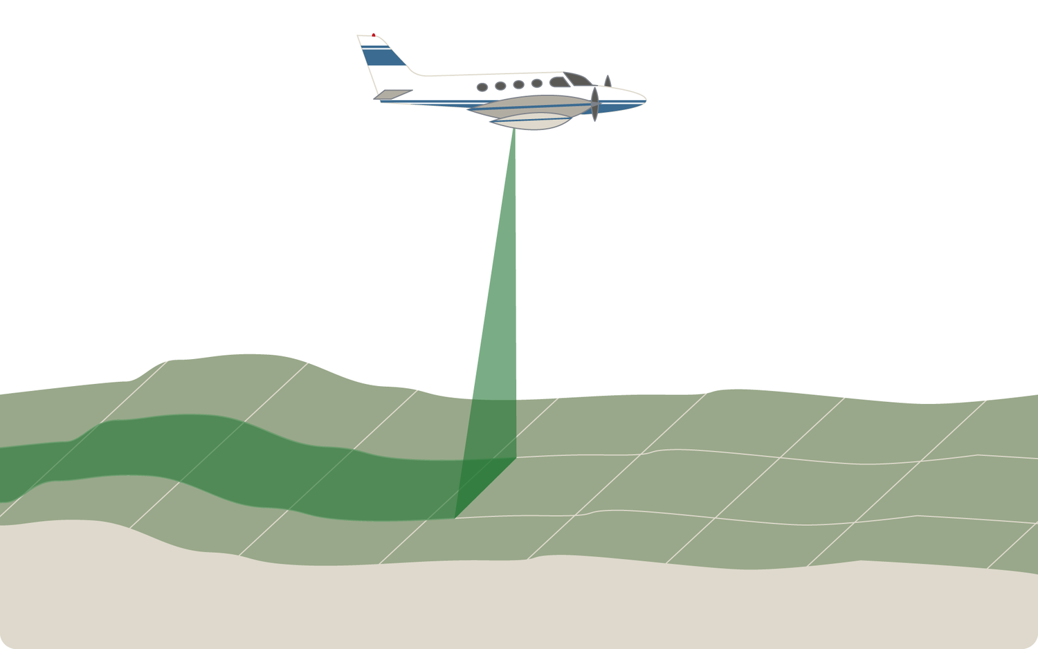 Per i lavori di misurazione, la scansione laser viene effettuata dall'aria. Un laser istallato su un aeroplano scannerizza il territorio sorvolato. A partire dalla posizione dell’aeroplano e dal tempo di ritorno impiegato dal segnale viene determinata la distanza fino al suolo. In questo modo si raccolgono informazioni sulla struttura – la topografia – della superficie terrestre.